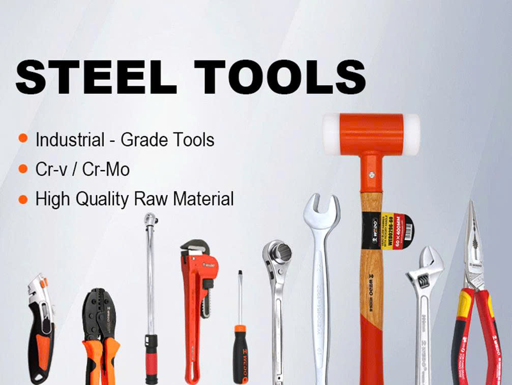 Các dụng cụ cầm tay bằng kim loại được làm từ nhiều loại nguyên liệu khác nhau, như búa, cờ lê, mỏ lết, kìm, tuýp vặn ốc, chìa lục giác và tua vít, v.v.,